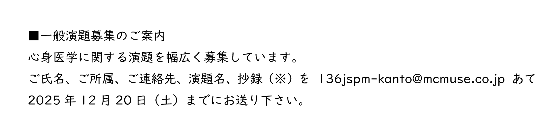 〒113-0033 東京都文京区本郷2-17-13 有限会社エム・シー・ミューズ内 TEL:03-3812-0383 FAX:03-3812-0376 E-mail:136jspm-kanto@mcmuse.co.jp